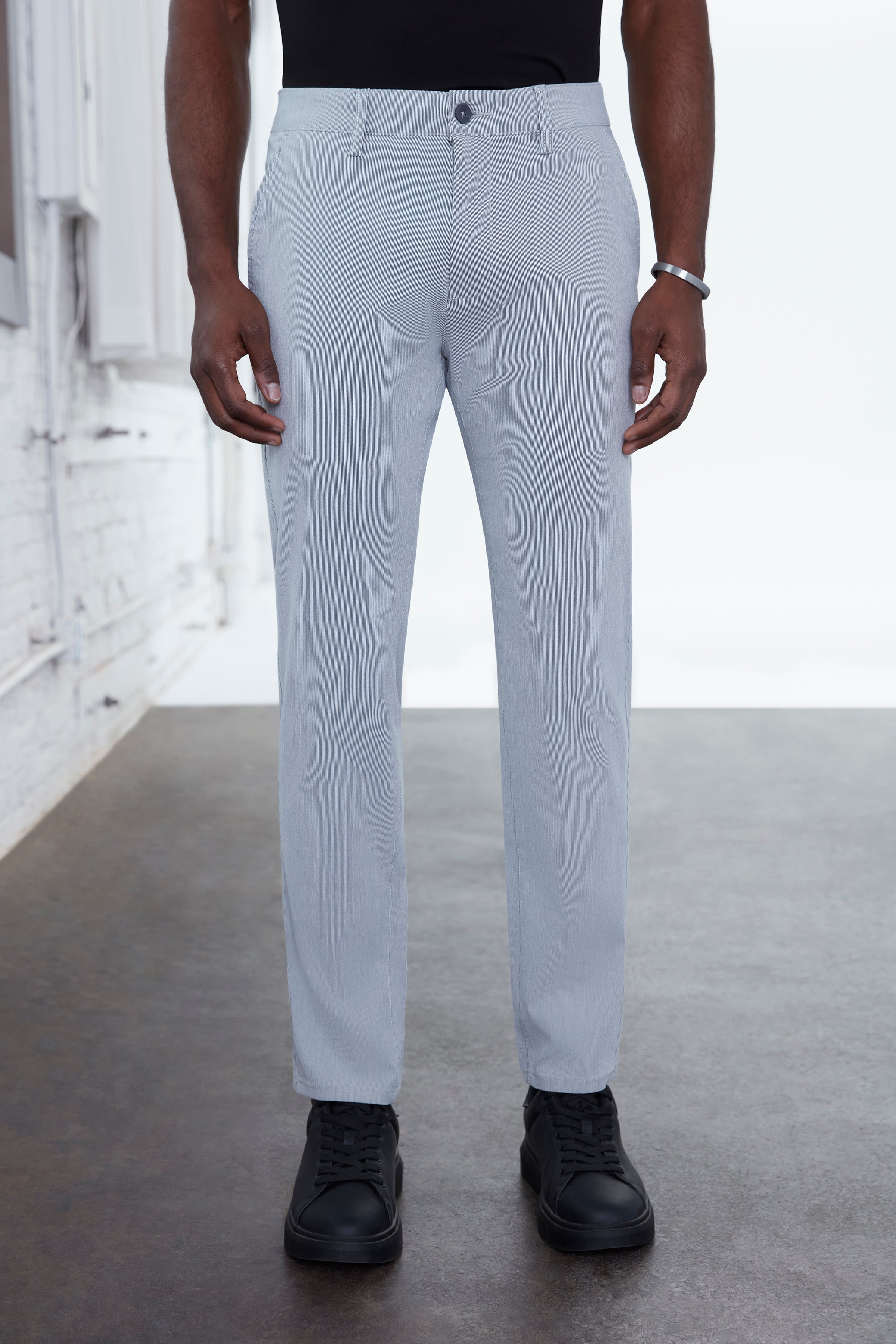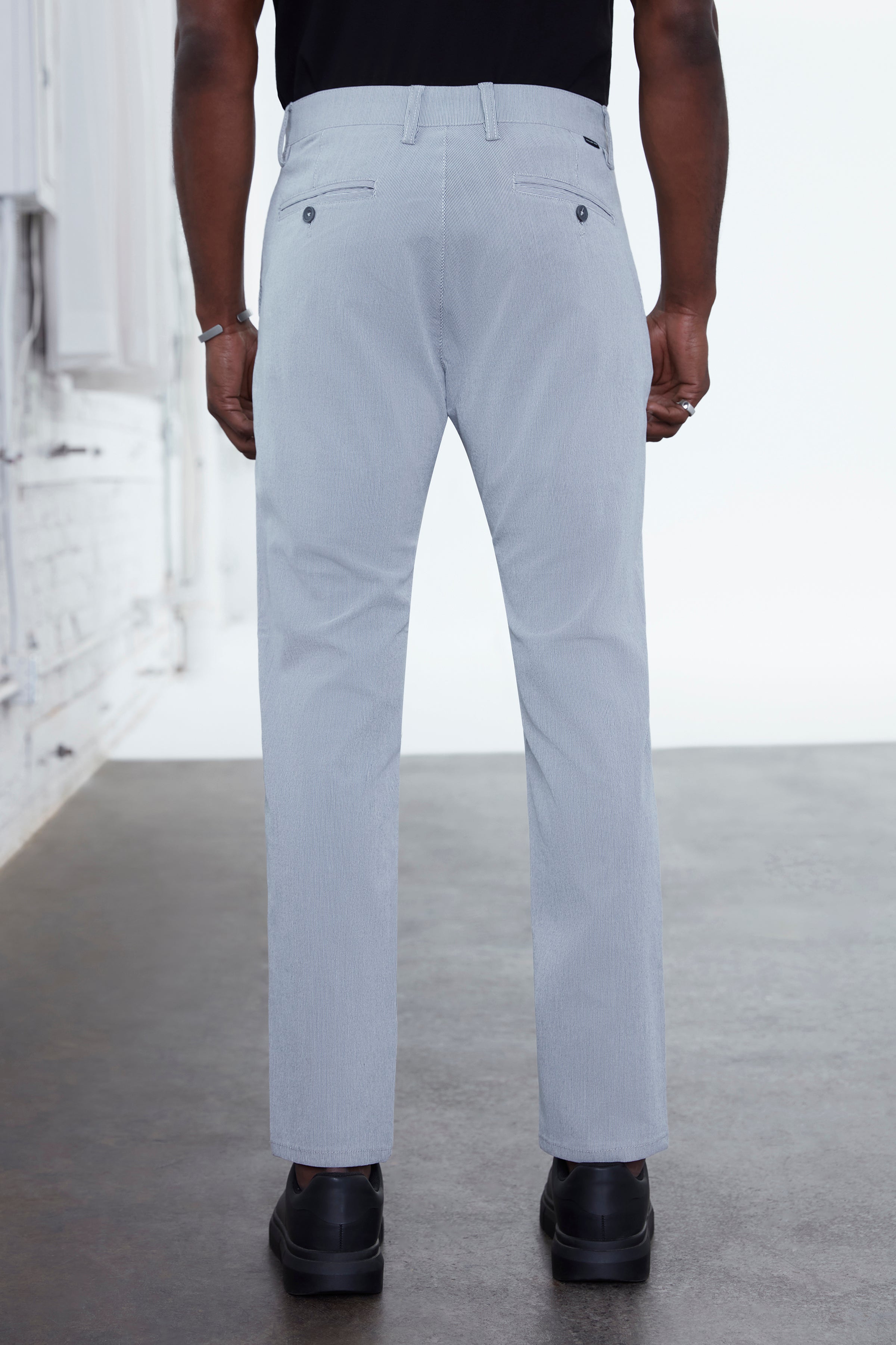 A refined essential with subtle texture, this classic-fit chino is crafted from a stretch stripe bungee fabric that delivers both structure and flexibility. Designed with a tailored silhouette and everyday versatility, it transitions seamlessly from office settings to off-duty wear while maintaining a polished look.