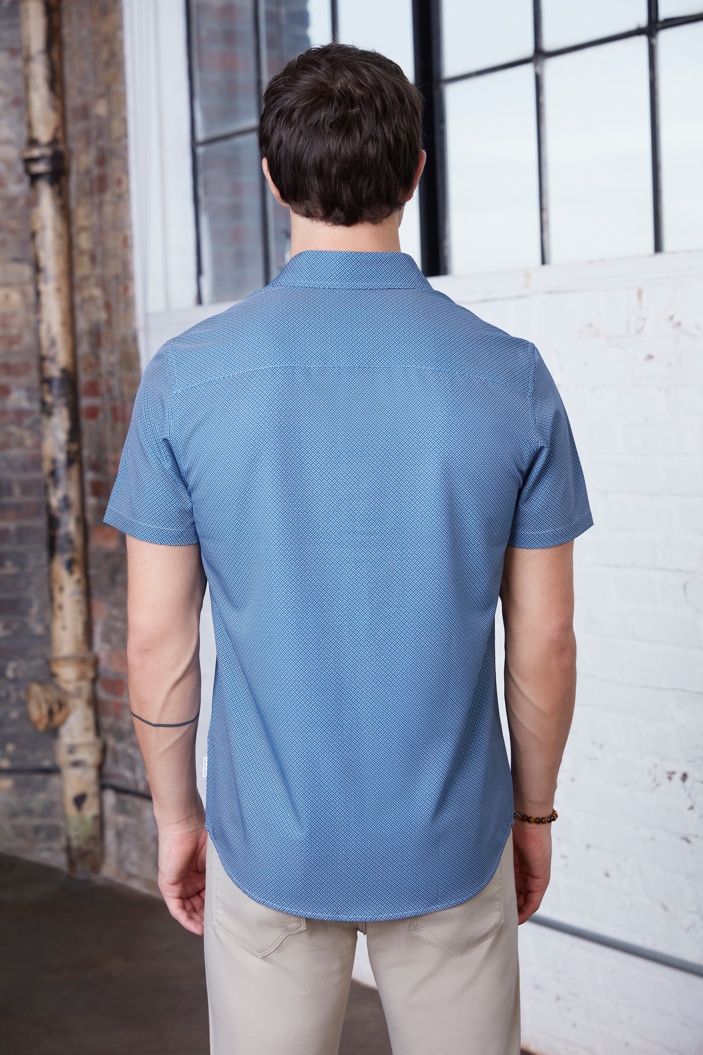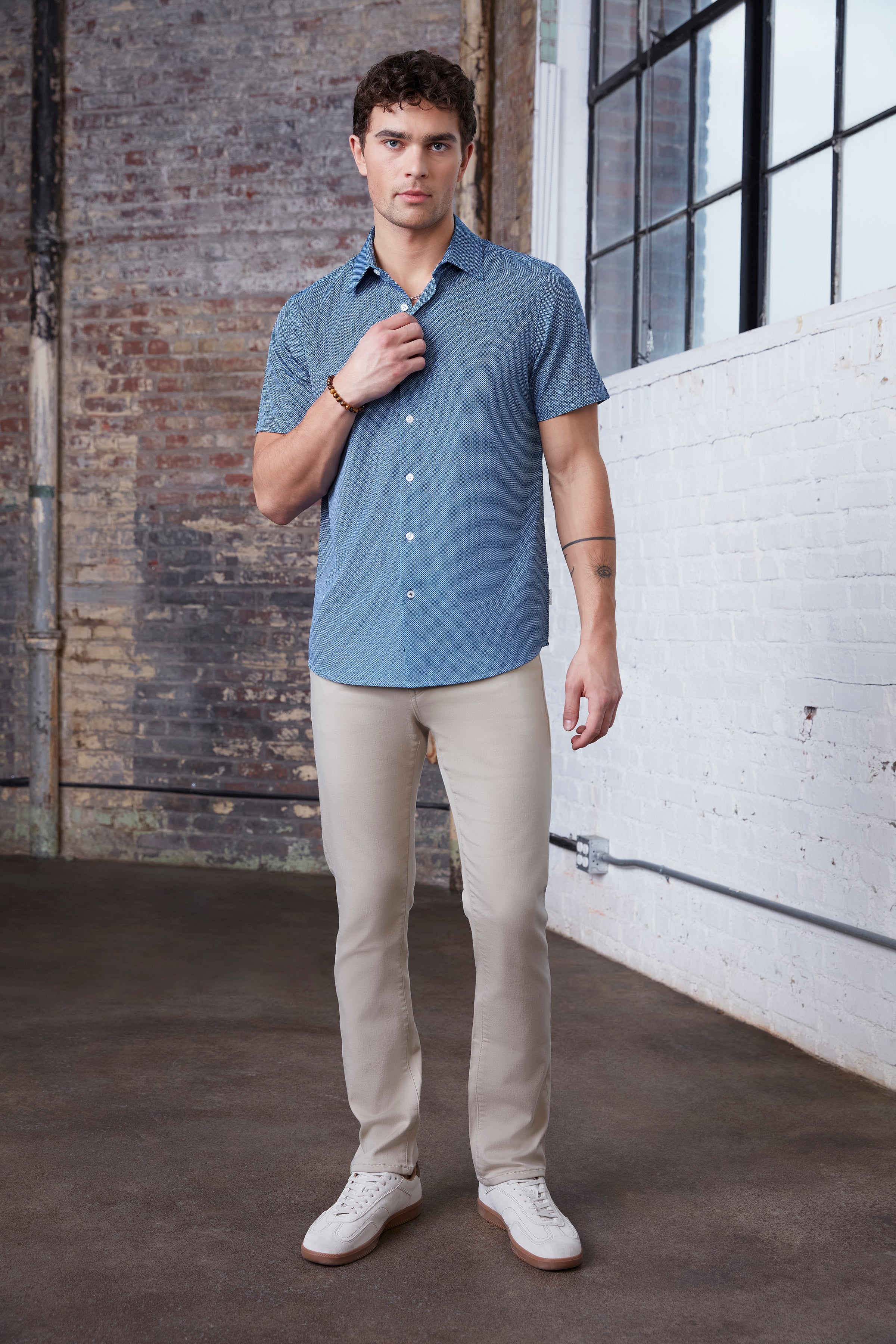 This short-sleeve modern-fit shirt for men is crafted from a technical stretch twill that delivers flexibility, structure, and breathable comfort. Designed with a sharper, contemporary cut, it follows the body while allowing natural movement for all-day wear. The subtle micro-pattern adds depth and a refined urban edge, making it ideal for city workdays, summer nights, and elevated casual styling with a clean, performance-driven feel.