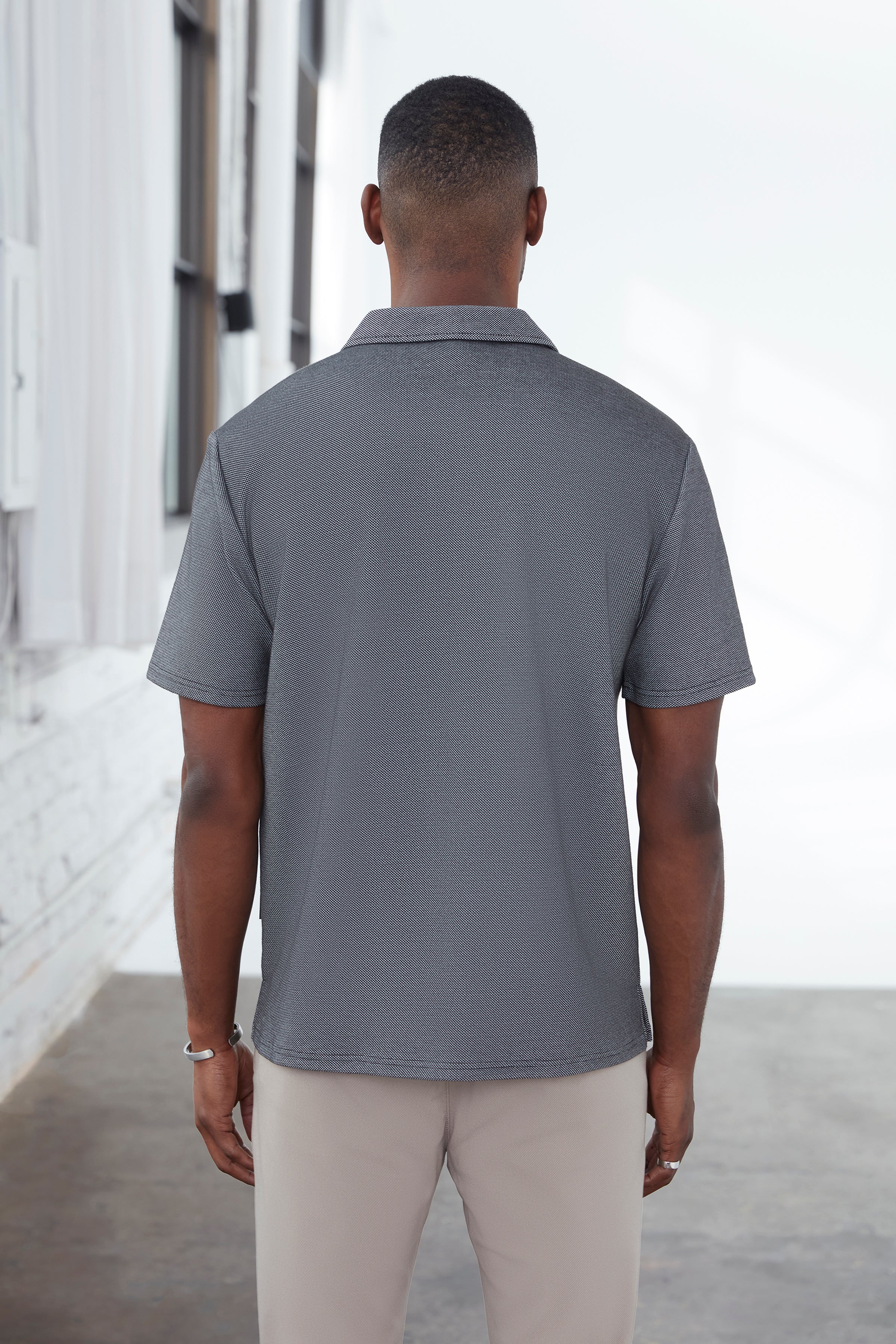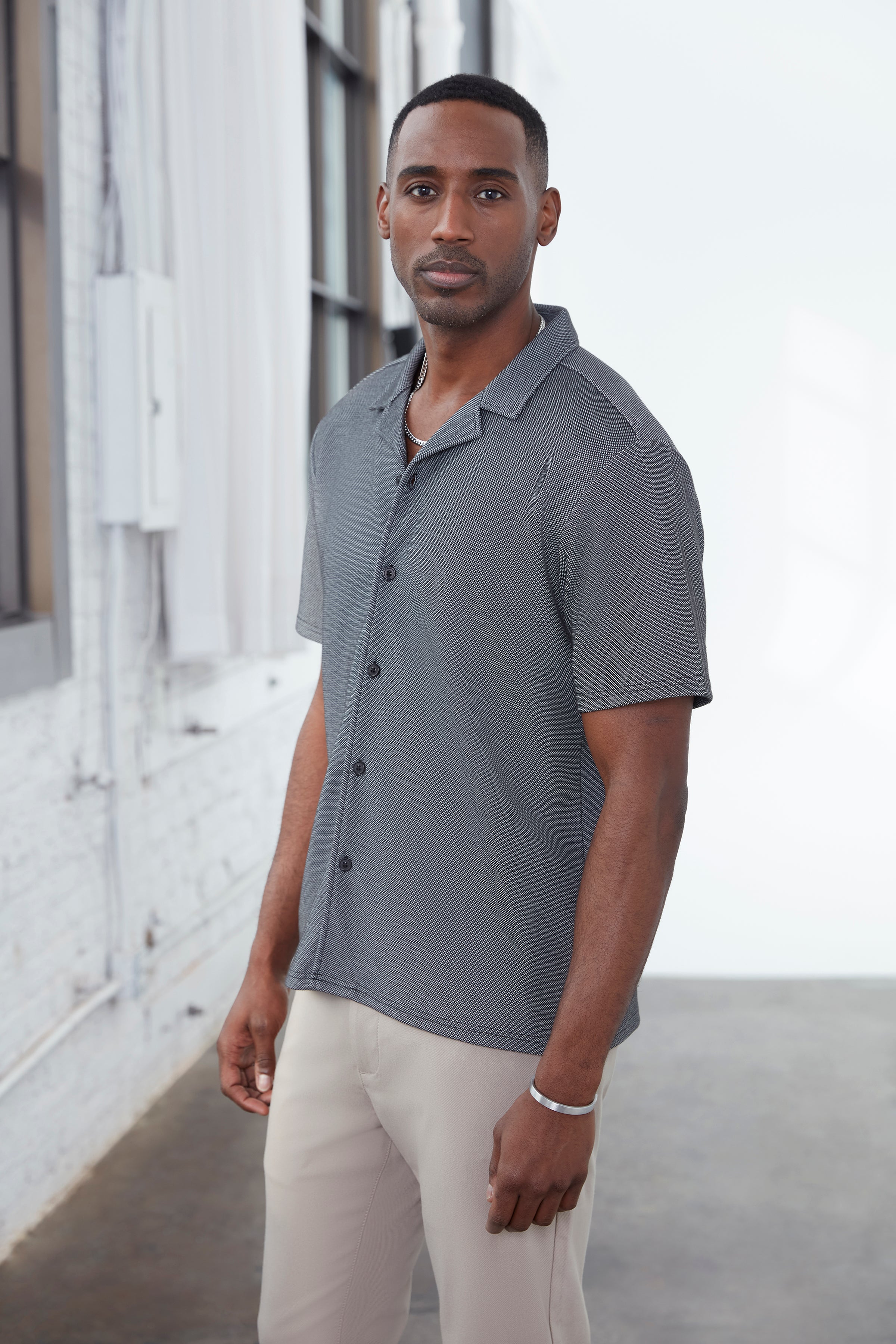 This short-sleeve camp collar shirt for men is crafted from a breathable knit fabric that delivers stretch, softness, and modern comfort. Designed with a relaxed silhouette, it creates an effortless drape that feels both contemporary and refined. The open camp collar adds a laid-back urban attitude, making it ideal for warm city days, travel, and elevated casual styling with a clean, minimalist edge.