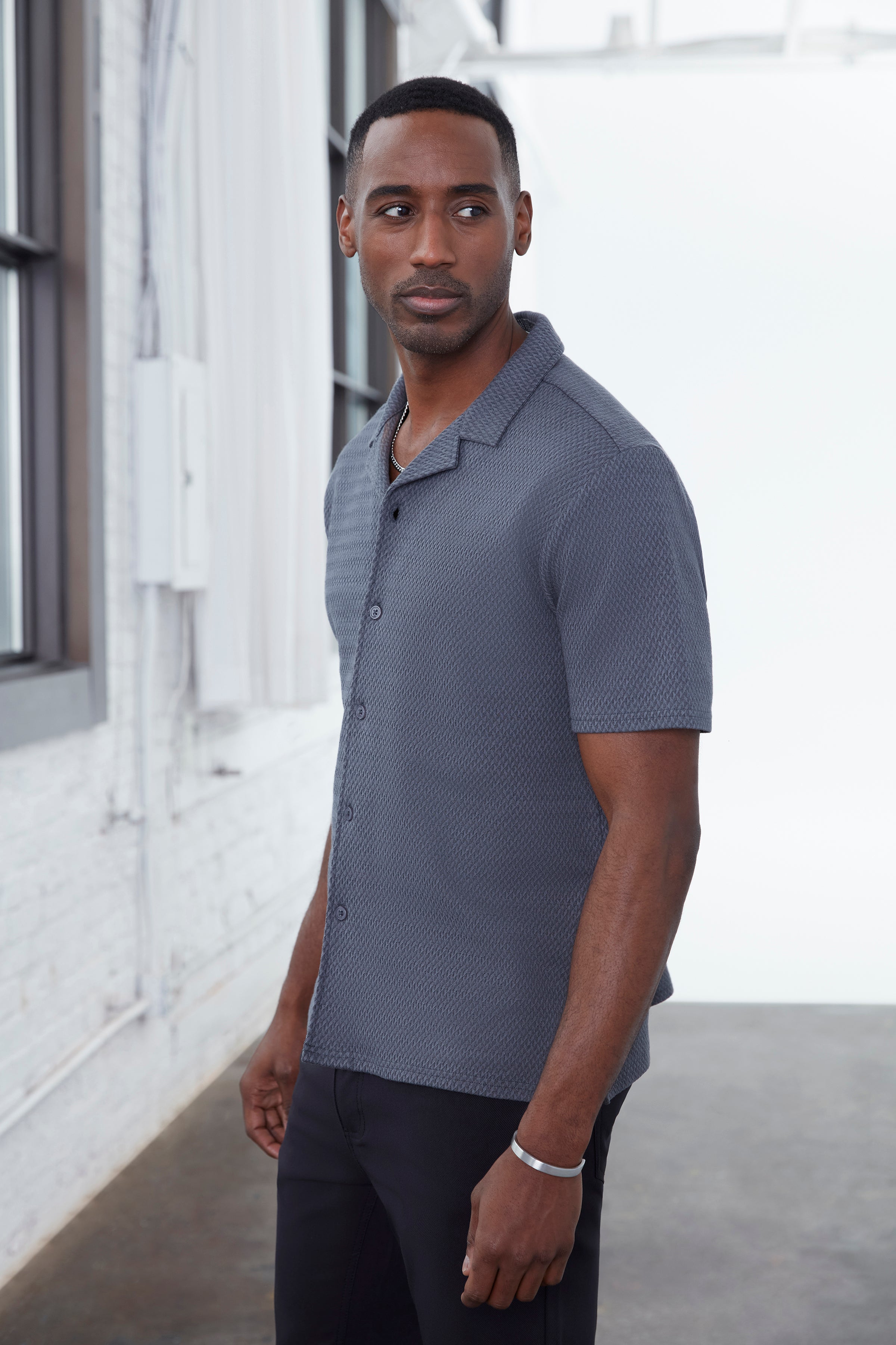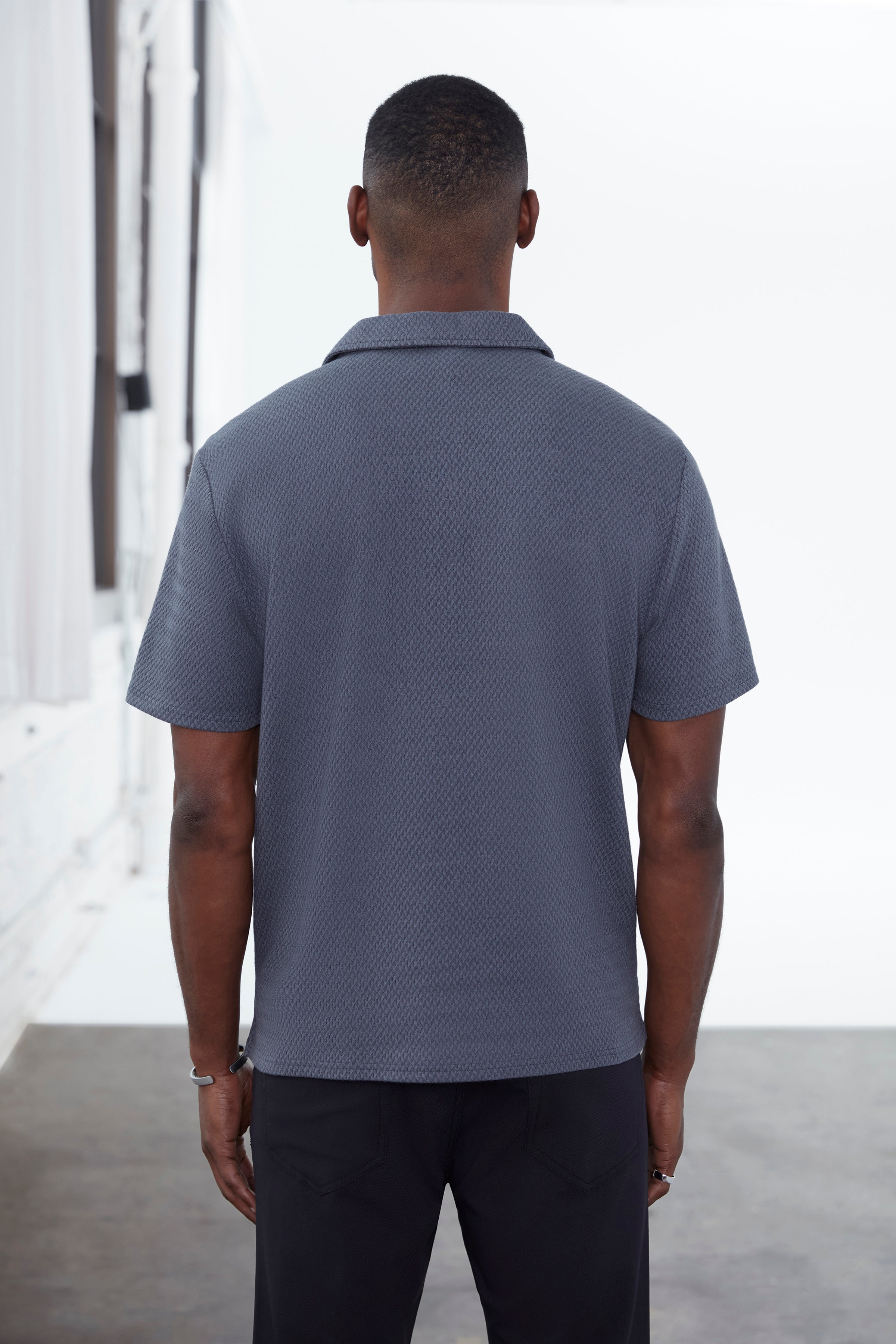 This short-sleeve camp collar shirt for men is crafted from a breathable jacquard knit that delivers subtle texture, stretch, and elevated comfort. Designed with a relaxed silhouette, it creates a refined yet effortless look suited for modern urban living. The micro-pattern adds visual depth while the open collar enhances its contemporary edge, making it an ideal piece for warm-weather city wear, evenings out, and polished casual styling.