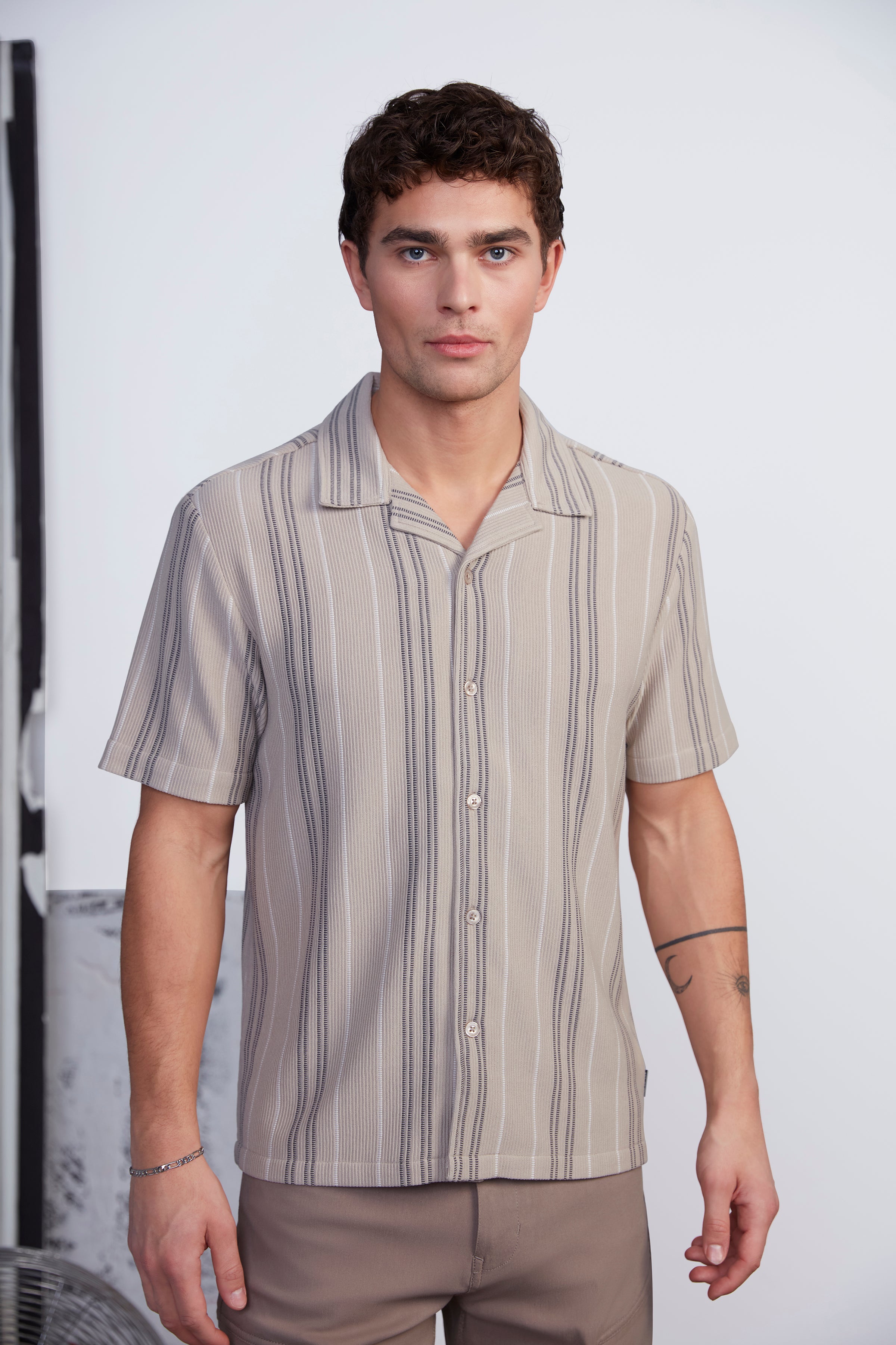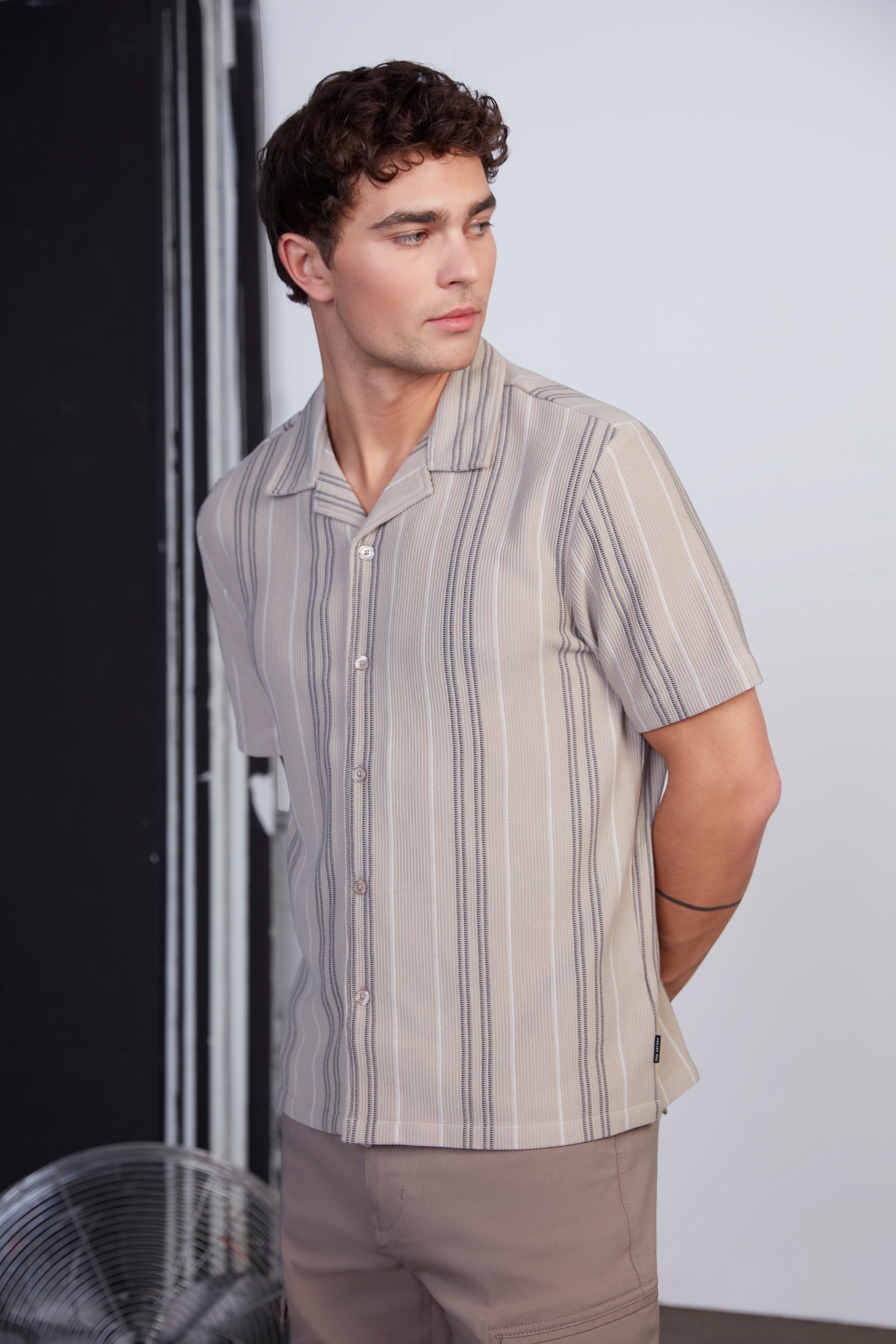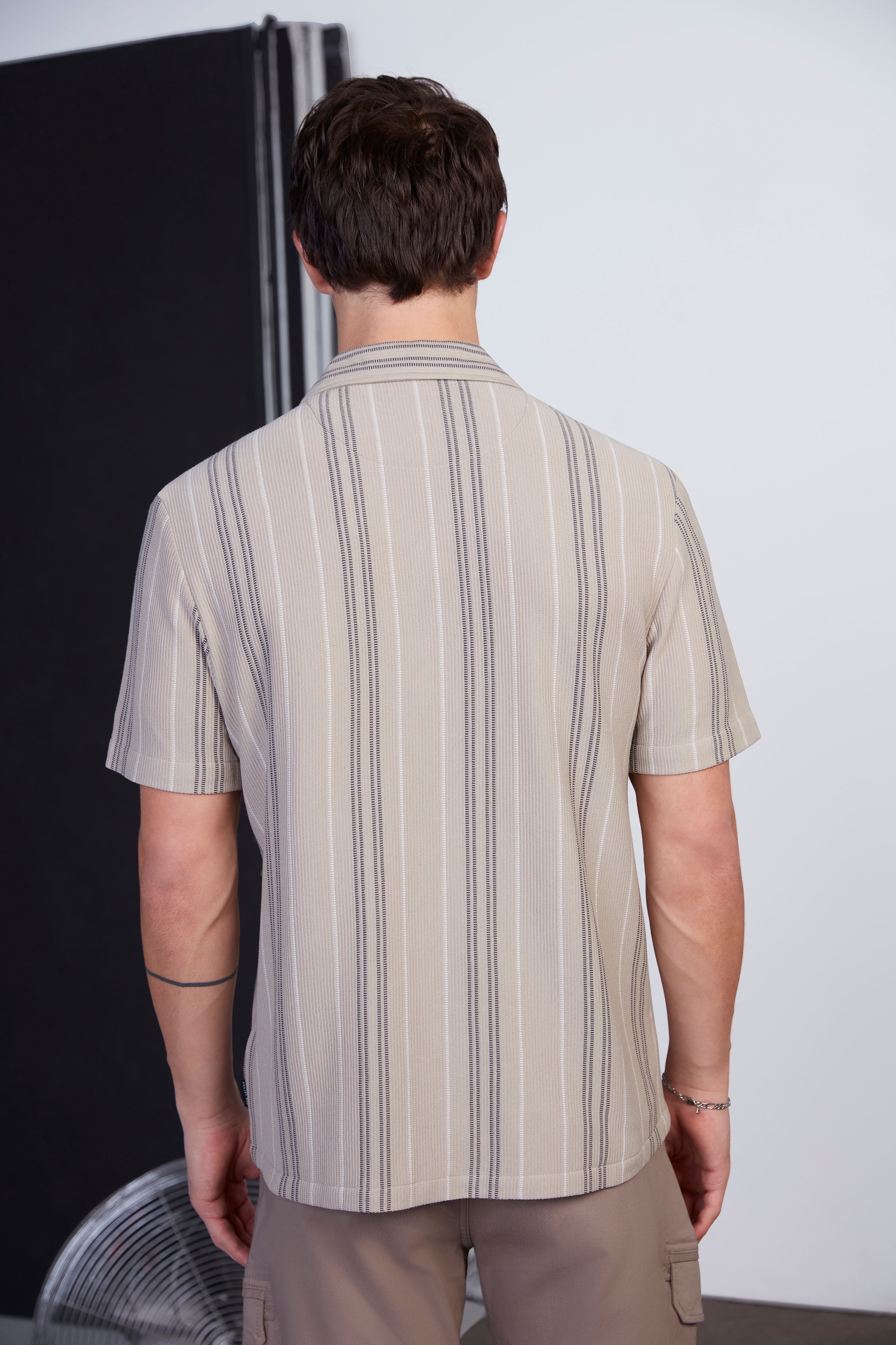 This short-sleeve striped shirt for men is built from a structured, midweight fabric that delivers durability with a smooth, comfortable feel. Designed in a regular fit, it offers a sharp yet relaxed silhouette ideal for urban summer layering. The vertical stripe pattern adds a modern, street-ready edge while enhancing visual length, making it perfect for city nights, travel, and elevated casual styling with breathable comfort and easy movement.