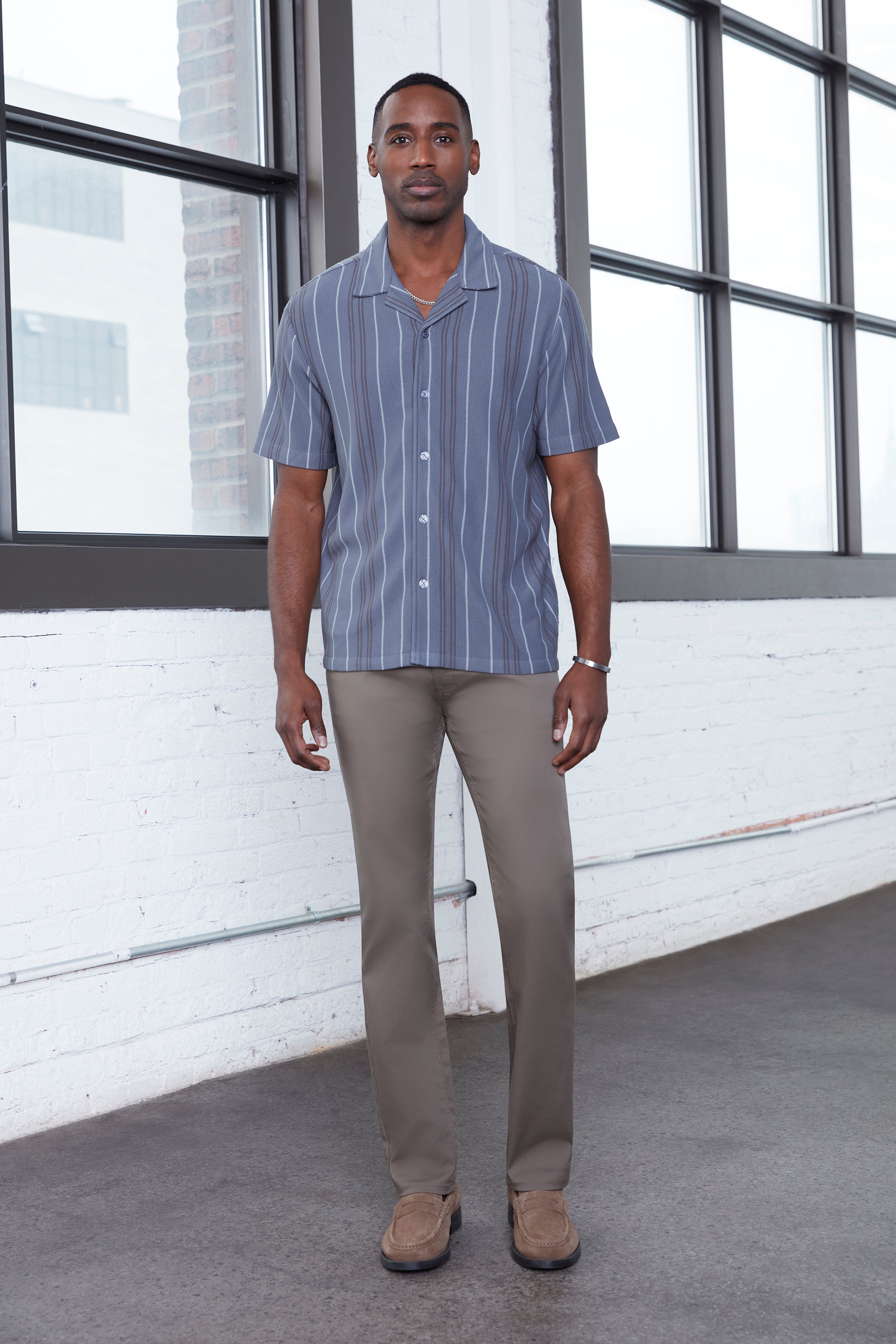 A refined essential, this classic-fit 5-pocket pant combines durability with stretch for all-day wear. The structured canvas fabrication offers a clean silhouette, finished with a straight leg and an approximate 32" inseam for a timeless profile that transitions seamlessly from work to weekend.