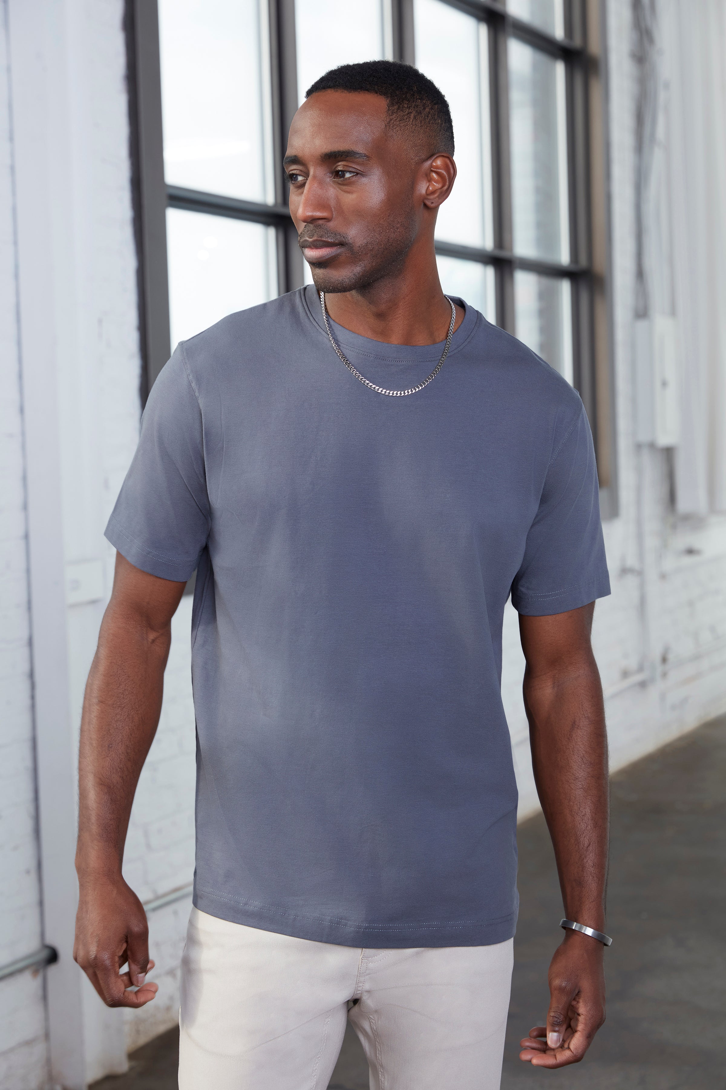 This classic-fit crew neck t-shirt for men is crafted from a soft, breathable fabric designed for everyday comfort and durability. The clean silhouette delivers a relaxed yet structured look that layers effortlessly or stands strong on its own. Lightweight and versatile, it’s a core urban essential made for city living, weekend wear, and modern casual styling. A go-to staple for building effortless outfits year-round.