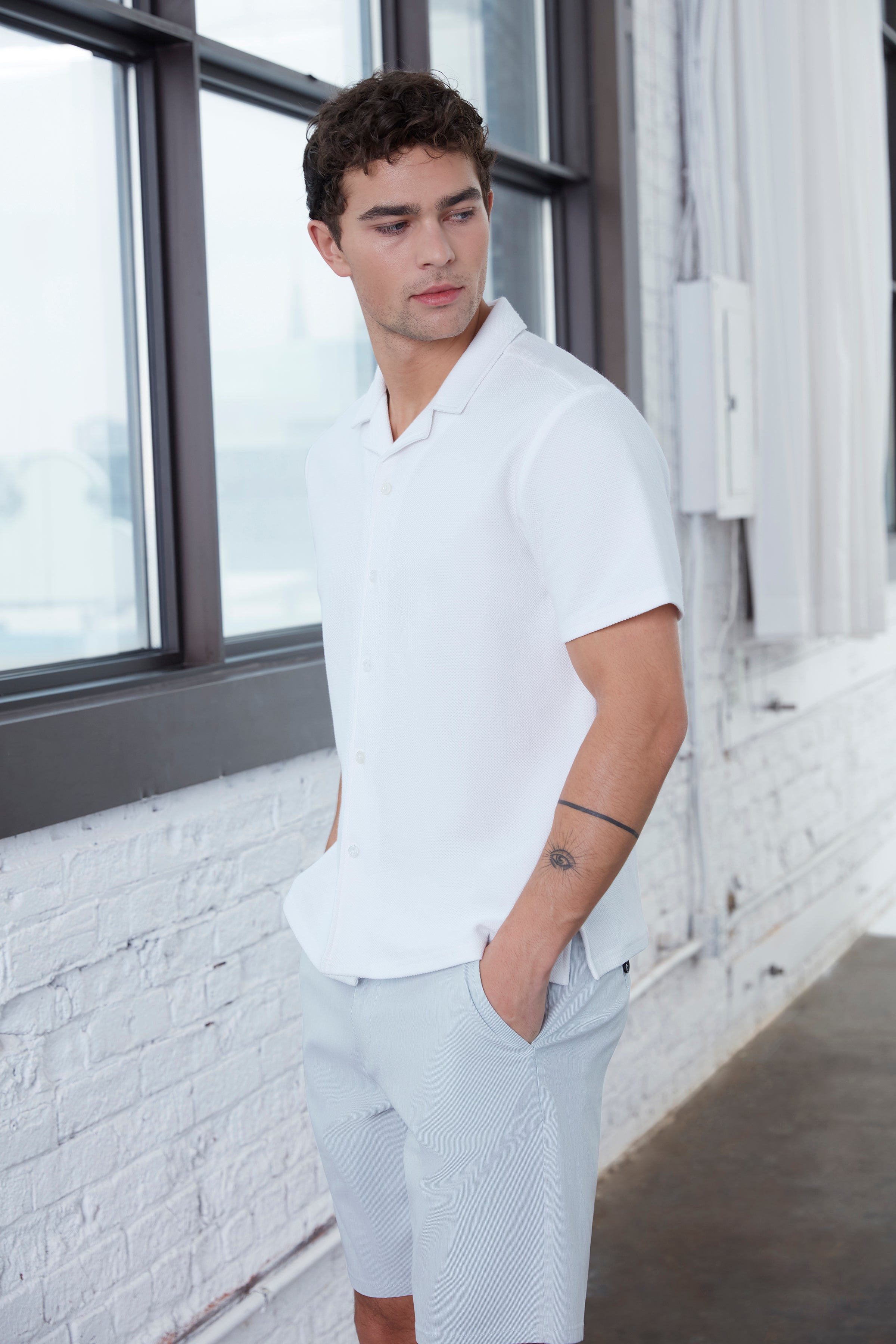 This short-sleeve camp collar shirt for men is crafted from a textured dobby knit fabric that delivers breathability, softness, and elevated comfort. Designed with a relaxed silhouette, it drapes naturally for a modern, effortless look. The subtle woven texture adds dimension while the open collar enhances its laid-back urban appeal, making it a refined choice for warm-weather city wear, travel, and contemporary casual styling.