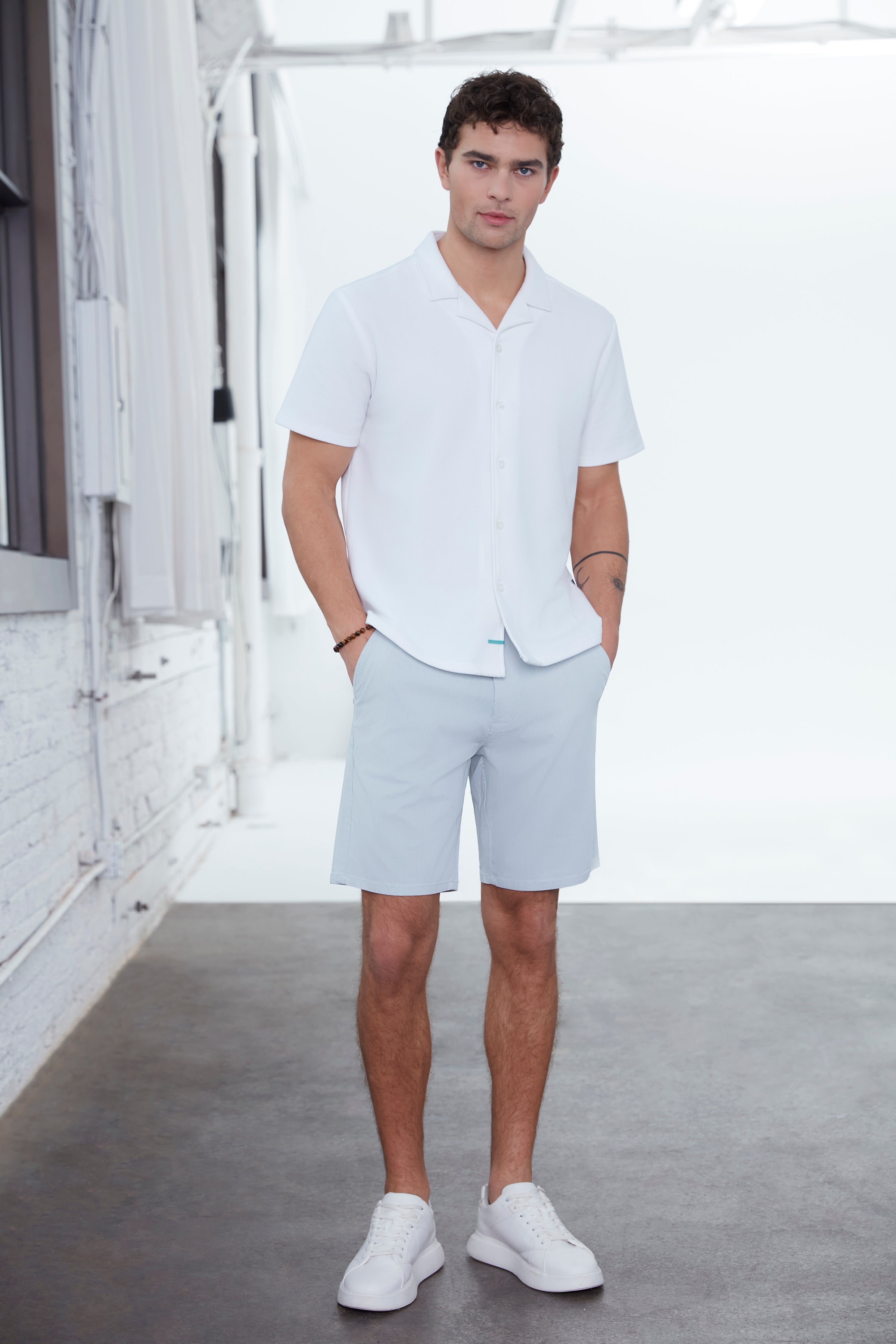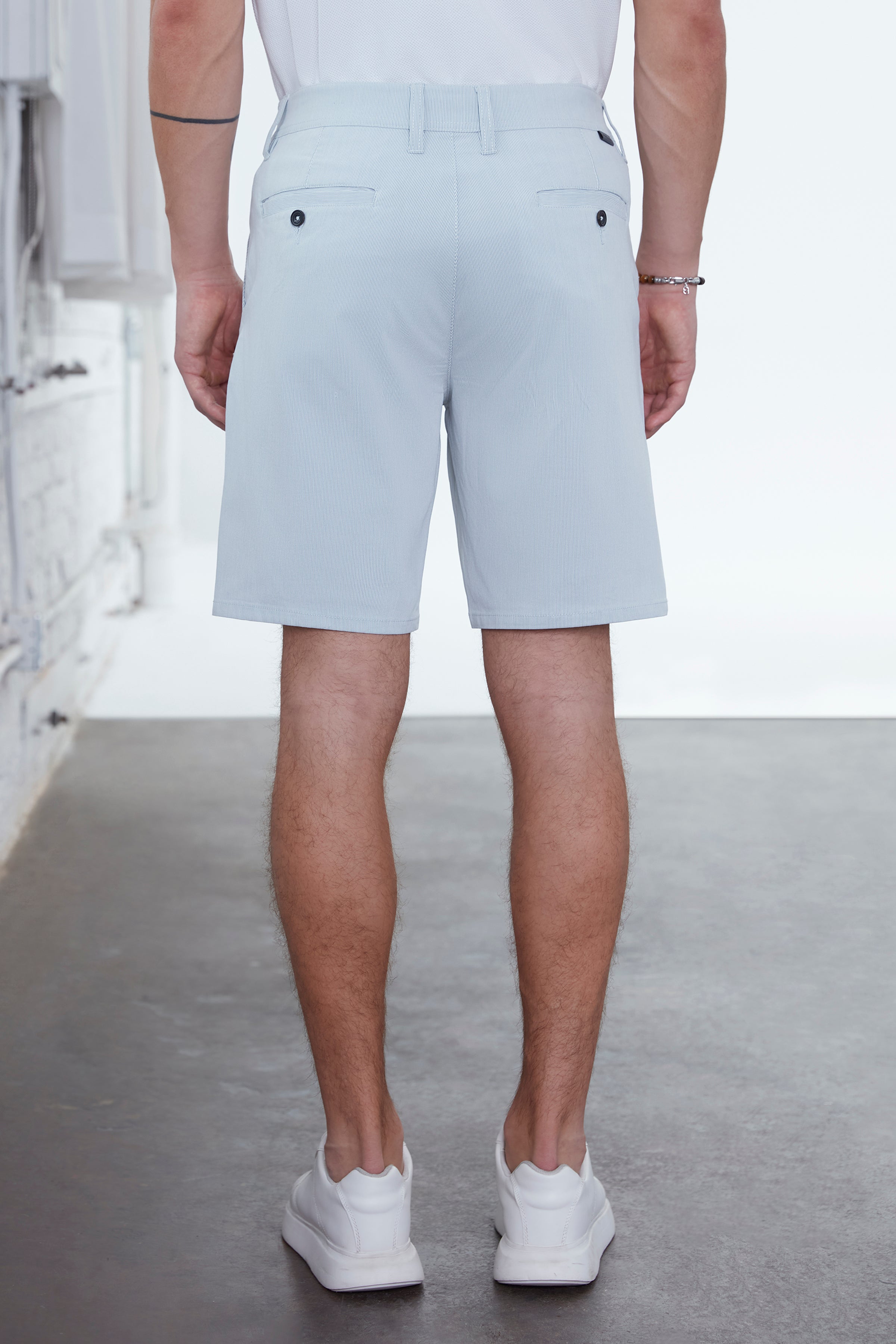 These chino shorts for men are crafted from a smooth stretch fabric that delivers flexibility, breathability, and elevated comfort. Designed with a classic fit and an above-the-knee length, they create a clean, modern silhouette ideal for warm urban days. The subtle stripe texture adds depth and refinement, making them a versatile choice for city wear, travel, and polished casual styling.